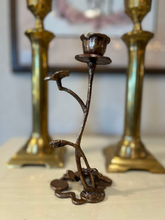 Metal Bronze Brass Frog On A Lily Pad & Dragonfly Candle Stick Holder