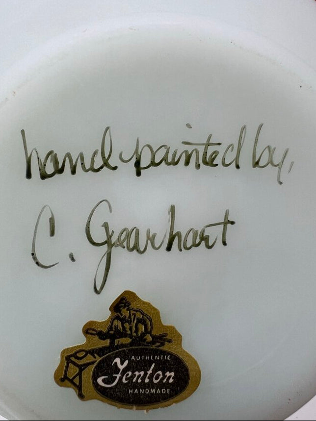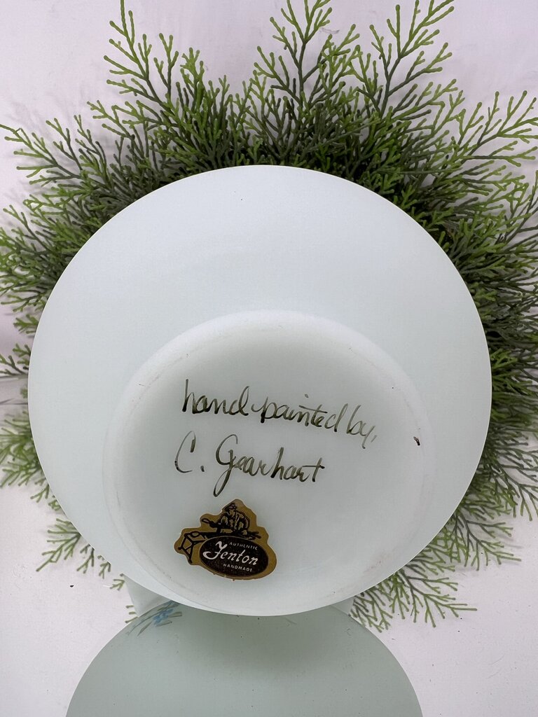 Vintage Fenton blue satin glass vase with a distinct matte finish. This art glass piece features a round body, a skinny neck and a dramatically ruffled or crimped top edge. The vase is hand-painted with delicate floral pattern of blue roses and green leaves. This piece is signed by the artist "C. Gearhart" and has a black and gold Fenton sticker on the bottom.