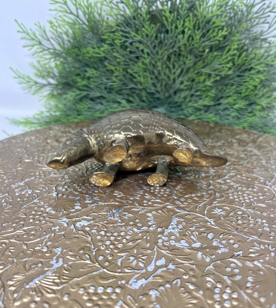 Vintage brass armadillo figurine. Figure has engraved life like qualities, specifically scales. Figure has an oval body and a long face that reaches down as well as four legs and a tail. Figurine is a heavy brass material with a brassy, shiny color.