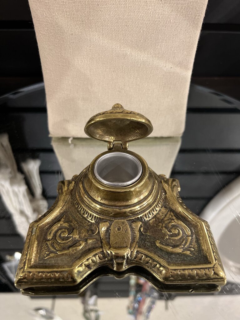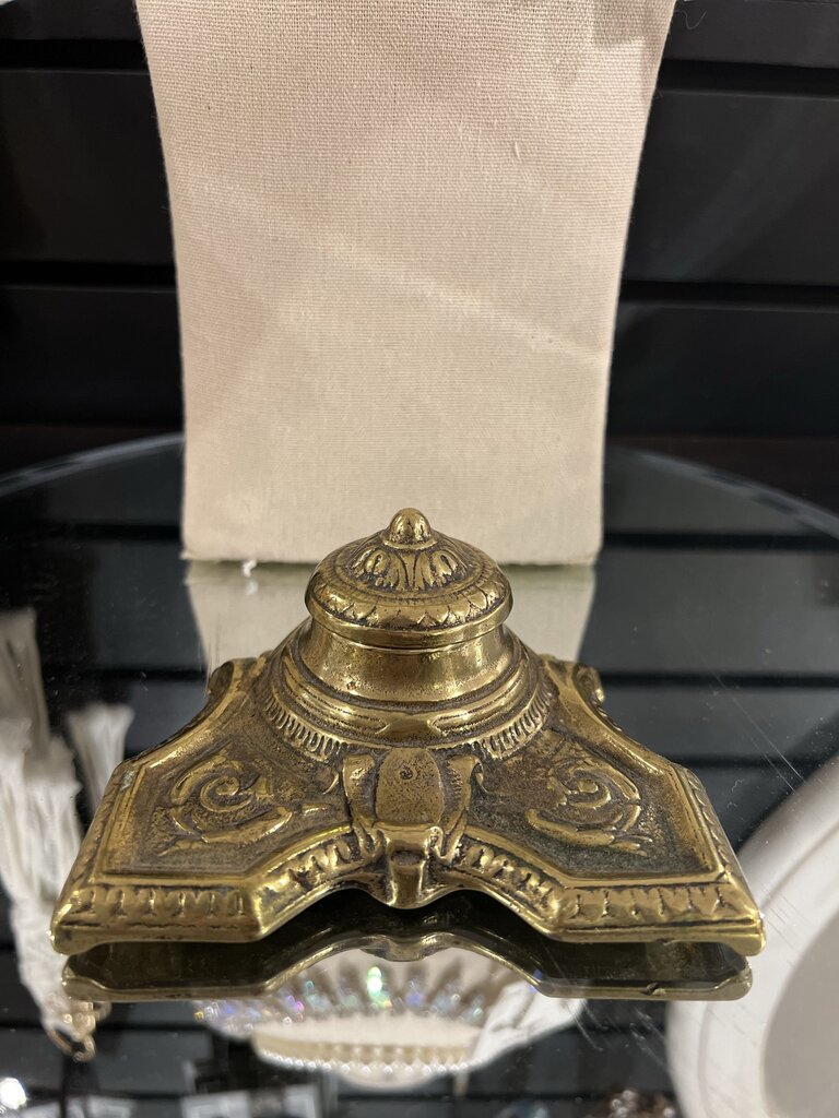 Collectible antique brass inkwell characterized by an ornate design featuring intricate foliage motifs. The inkwell includes a hinged lid and a round base, adding both elegance and functionality. This style often incorporates a removable inner insert for holding ink, making it easy to fill and clean. A charming piece that reflects classic craftsmanship and adds vintage character to any desk or collection.