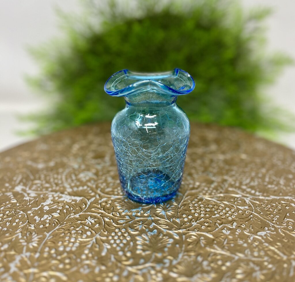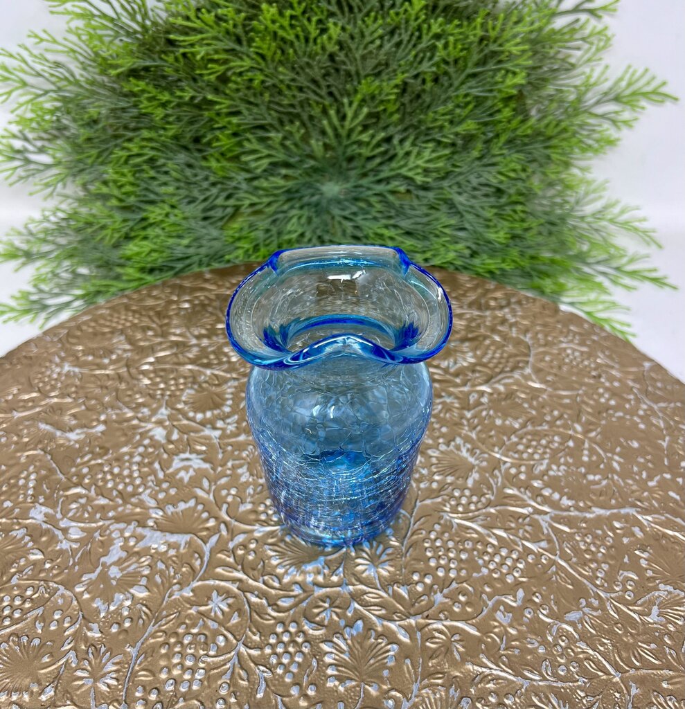 Collectible clear blue crackled glass vase with ruffled edge. Vase is a small oval shape with a bottle neck opening and ruffled vase edge that has three large ruffles. The base of the vase has a smooth crackled finish.