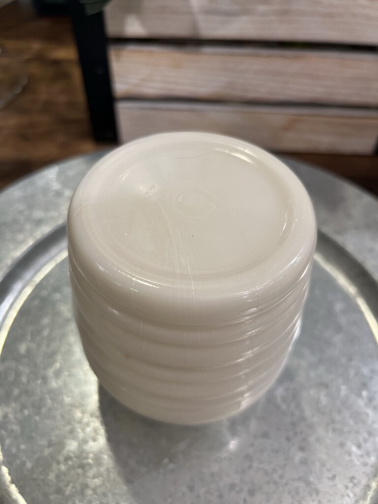 This charming vintage grease jar is made from Fire-King ivory milk glass, featuring a classic ribbed design that adds texture and visual interest. The jar is topped with its original red and white metal lid, which showcases a colorful tulip design, adding a cheerful and nostalgic touch. Crafted for both functionality and style, this jar reflects the timeless appeal of mid-20th-century kitchenware. Its durable milk glass body is perfect for display or use, making it a delightful addition to a vintage kitchen collection, farmhouse décor, or Fire-King memorabilia.