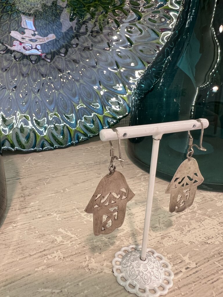Collectible silver-toned dangle earrings, each crafted in the shape of a Hamsa hand, a traditional protective symbol. The front of each earring features intricate embossed detailing and a small round reddish-orange stone set in the center of the palm. The back of the hand is plain silver-toned with no etching or markings. The earrings hang from standard fishhook ear wires for easy wearing.