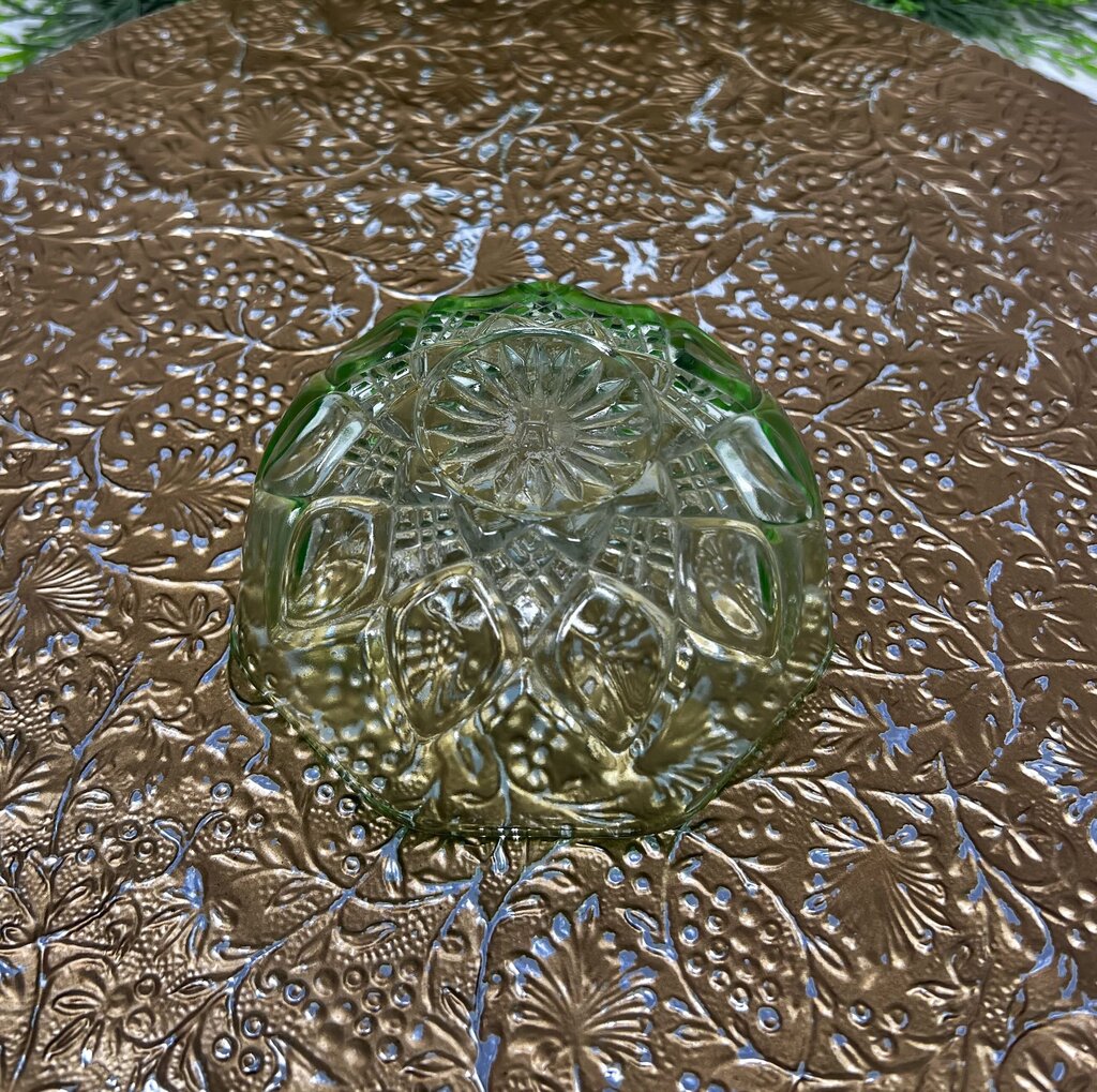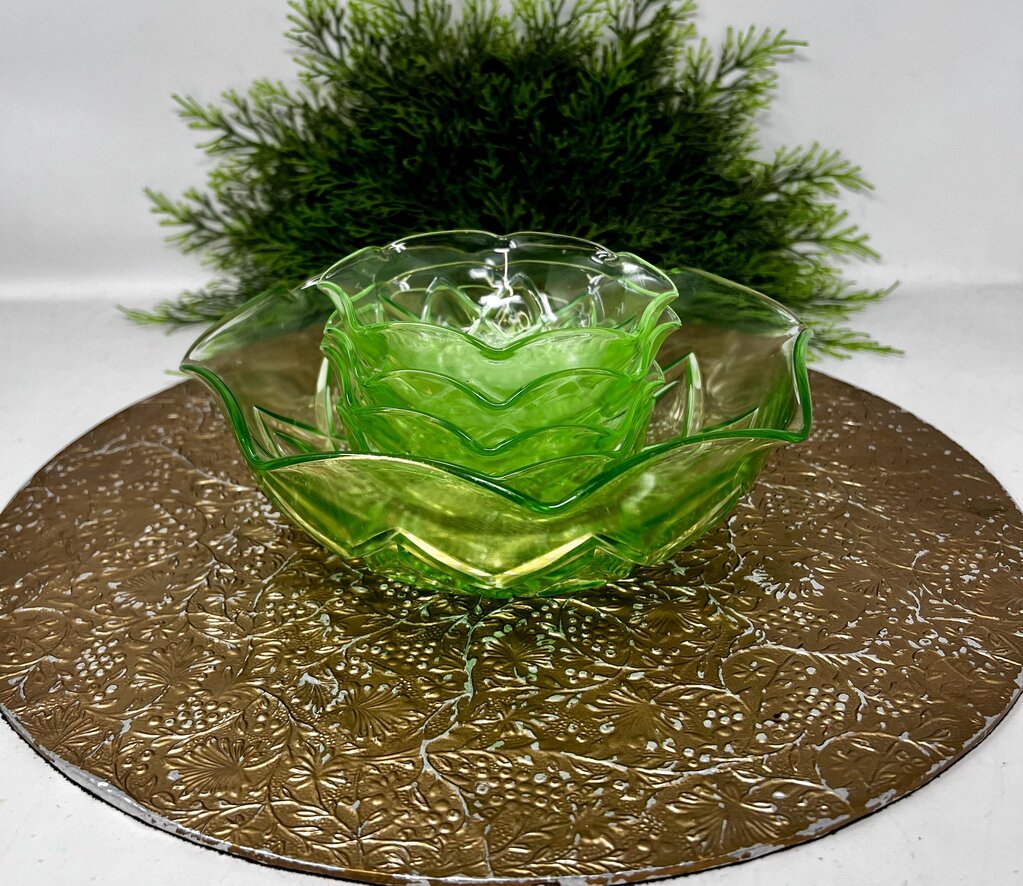 Collectible Hazel Atlas Uranium glass 5 piece bowl set. The set comes with 4 smaller bowls and 1 larger bowl. Each bowl has a ruffled edge and a cut glass diamond pattern. The inside of the bowls have a smooth finish. On the bottom of each bowl is a small H A symbol. The bowls are made with a clear light green uranium glass but when held under a black light it glows!