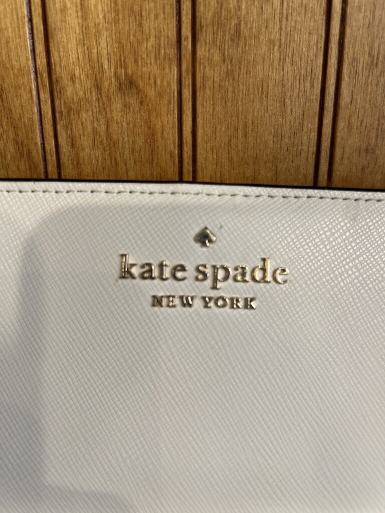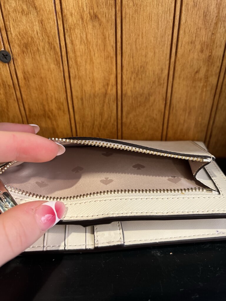 This collectible, sleek, and stylish Kate Spade New York accessory showcases a simple yet elegant design. It features a light neutral exterior with a textured finish and gold tone lettering on the front, giving it a polished and sophisticated look. The interior is thoughtfully organized with multiple card slots and a clear ID window, making it practical for everyday use. Its slim shape allows it to fit easily into a purse or bag while still holding essentials like cards, cash, and identification. The back of the wallet includes a convenient zippered pouch for added storage, and all hardware is finished in gold tone for a cohesive, refined touch. Overall, it beautifully combines functionality with classic, fashionable style that reflects the brand’s signature aesthetic.
