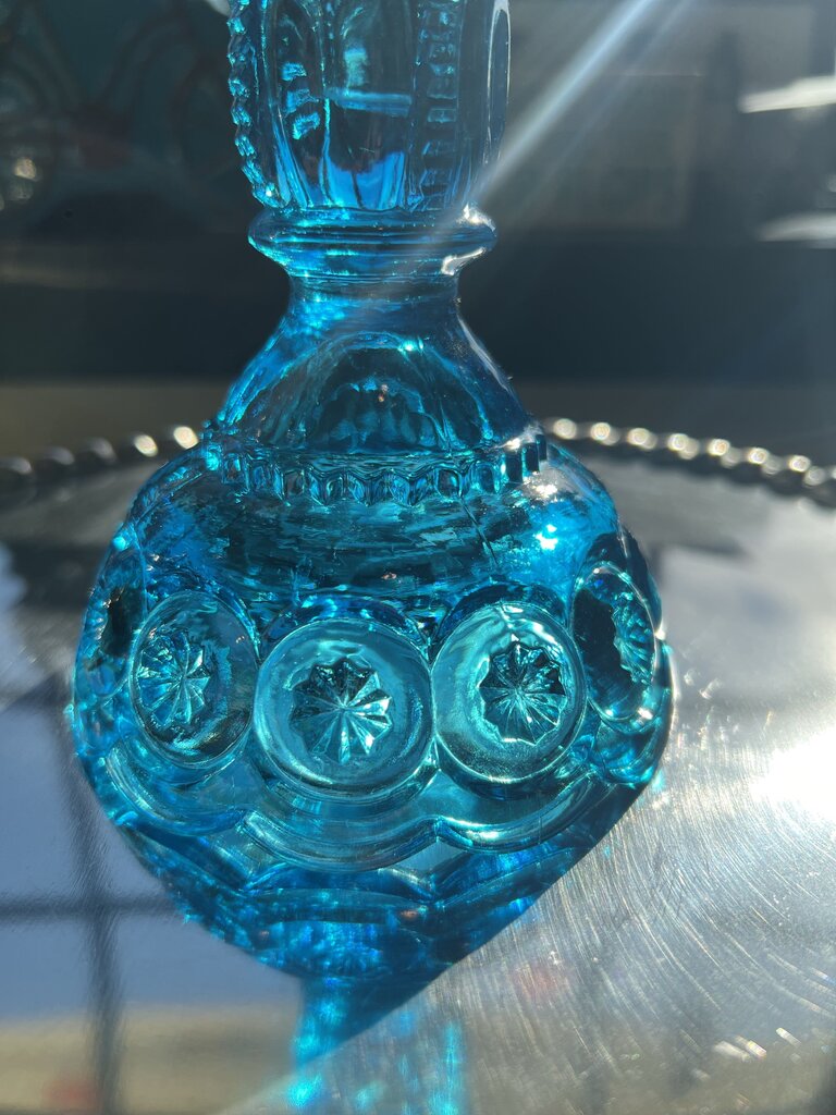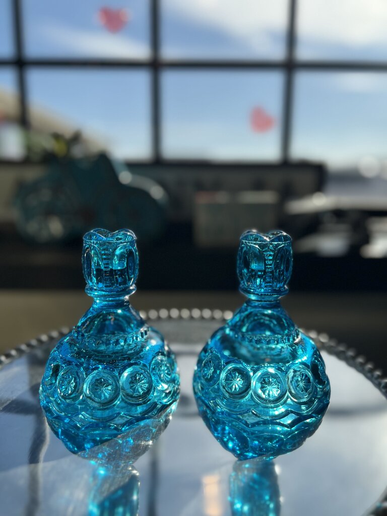 Vintage collectible L.E. Smith Moon and Stars blue glass candlestick holders, a popular pressed glass design from the 1970s. These charming pieces feature a rich colonial blue color and the distinctive “Moon and Stars” pattern, showcasing oval imprints accented with horseshoe-shaped diamonds and starburst circles. The glossy finish beautifully highlights the embossed details, while the sturdy design is perfectly crafted to hold a standard taper or dinner candle. A timeless addition to any vintage glass collection or retro-inspired décor.