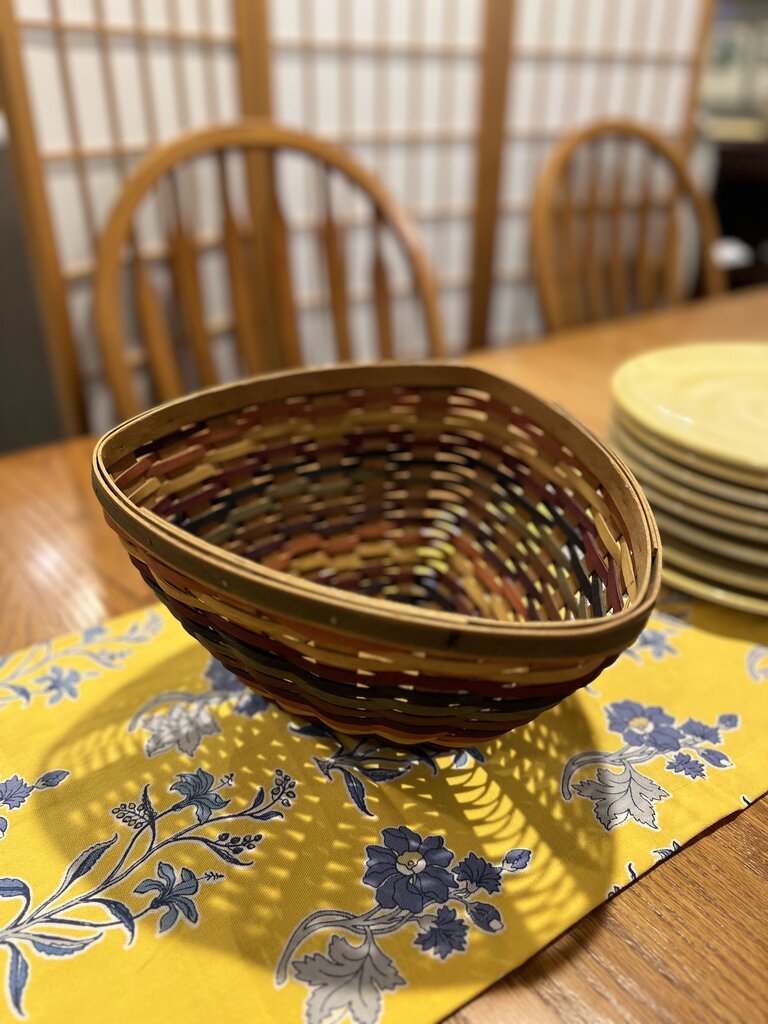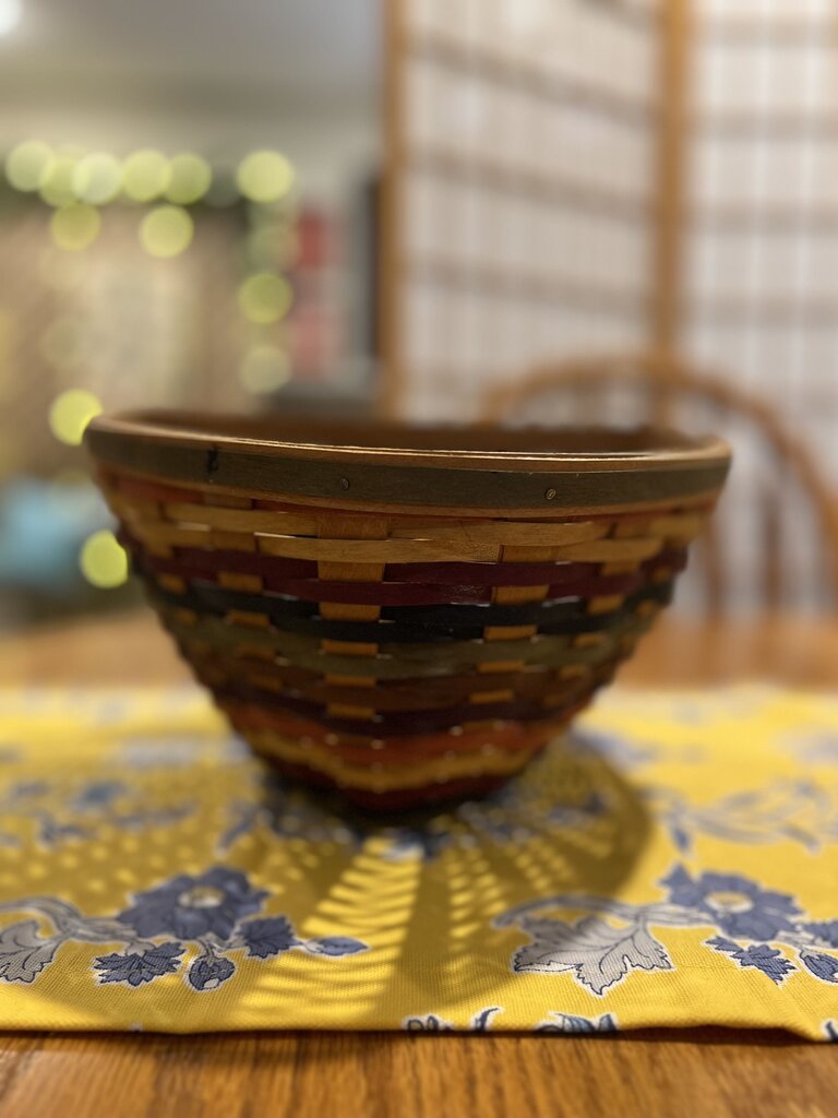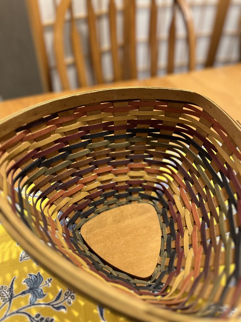 Collectible Longaberger Fiesta Bowl Basket, characterized by its unique triangular shape and vibrant multicolored weave. The colorful pattern features a variety of dyed wood splints, including shades such as sage, Collectors Club blue, deep red, maple leaf yellow, orange, purple, and rich brown. Handcrafted and signed by a member of the Longaberger family on the bottom of the basket, it also includes the year and maker’s mark. Please note, the plastic liner protector does not come with this basket.