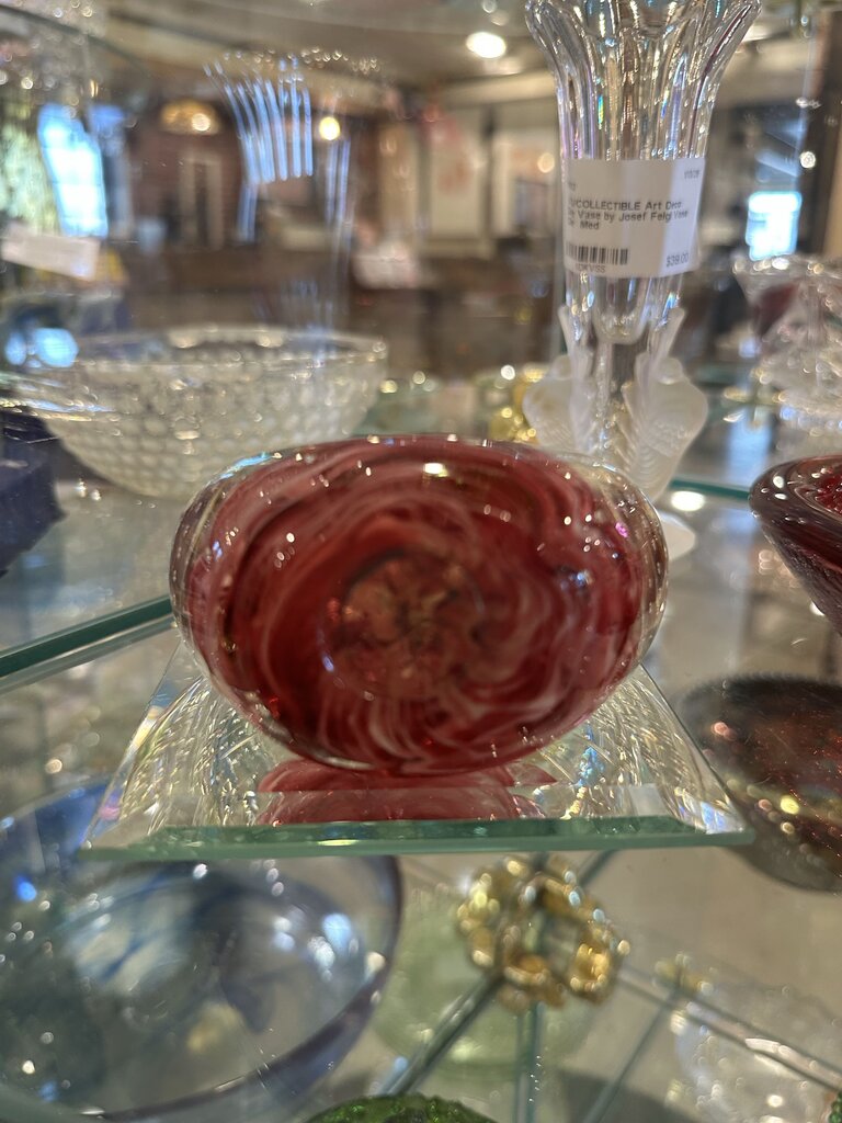 Vintage art glass paperweight crafted by American studio glass artist Monte Dunlavy. The piece features a clear glass exterior surrounding a central upward-reaching pink and white swirl motif, a style often referred to as a trumpet or amaryllis flower design. The internal design is further enhanced by controlled bubbles, precisely placed air pockets that add depth and catch the light, creating a sparkling dimensional effect within the glass. The smooth, polished exterior beautifully magnifies the delicate interior artistry. Dunlavy marks his pieces, and this example features his name hot-stamped into the base, confirming its authenticity. Known for his detailed floral-inspired designs and expert glasswork, Monte Dunlavy’s paperweights are highly regarded among collectors of American studio art glass. Both decorative and collectible, this piece makes an elegant addition to any art glass collection or desk display.