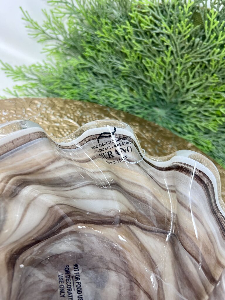 Collectible Murano art deco ruffled glass bowl. Bowl is a mixture of brown, cream and white colors with multiple swirls and ruffles. This bowl has many large ruffles that give it a bowl shape. Murano bowl has original tags.
