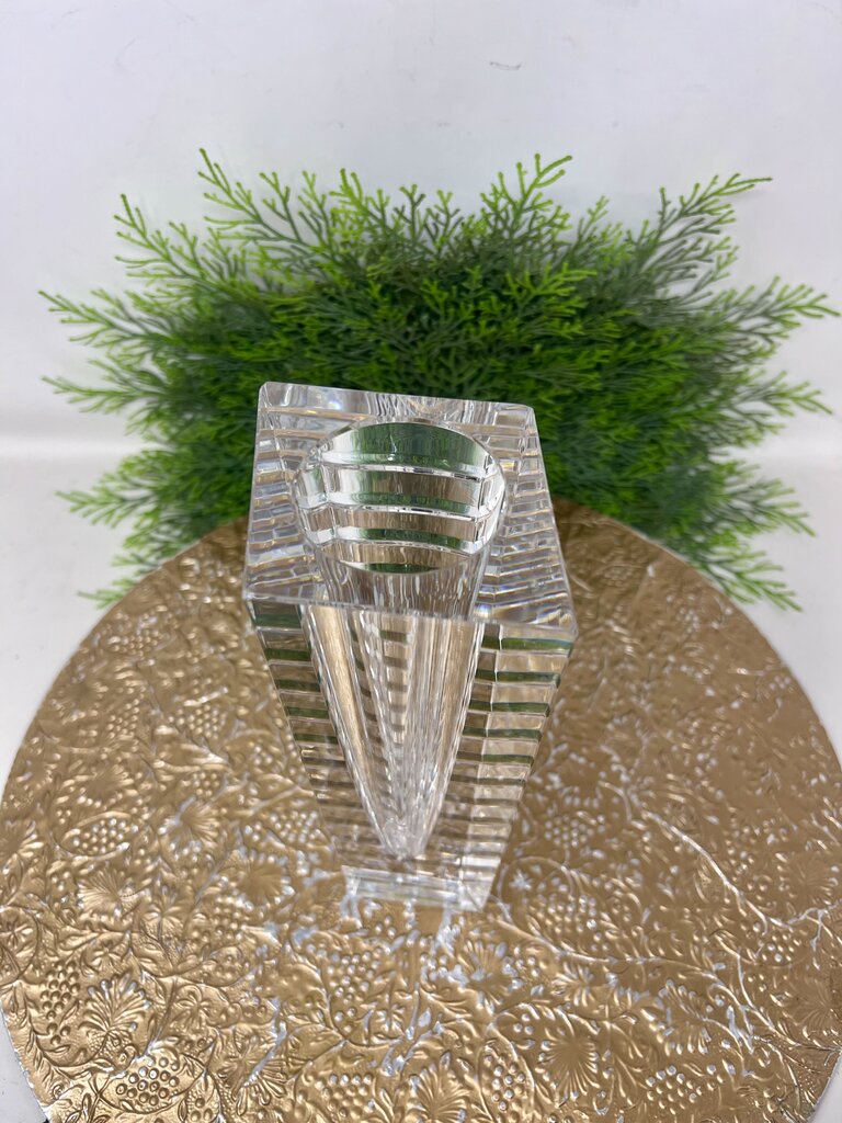 Oreefors Sweden multi faceted crystal vase. Tall crystal clear vase with four distinct sides, all sides are smooth and clear, the last side has a ribbed like texture. From the top angle of the vase it is shaped as an abstract diamond. Vase opening is a large circle on the top of the vase that becomes smaller further in the vase.