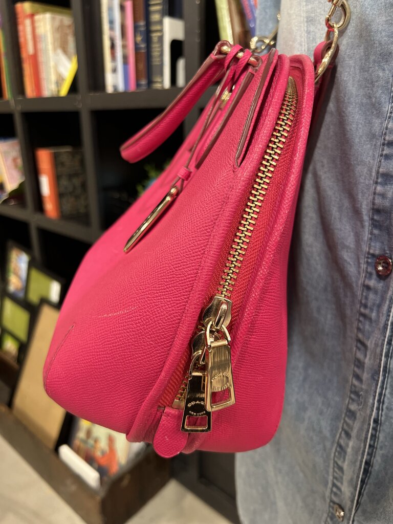Collectible stylish Coach dome satchel in ruby pink. This streamlined handbag features a classic domed silhouette with structured double top handles and a long, adjustable crossbody strap for versatile carrying options. A signature gold-tone turnlock closure on the front secures a hidden exterior pocket, while the main compartment features a zip closure to keep belongings safe. Inside, the bag includes a cell phone pocket, a zip pocket, and additional multi-function pockets for organized storage. Finishing details include polished light gold hardware, a matching leather hangtag, and a spacious interior lined with pink coordinating fabric printed with the Coach logo throughout.