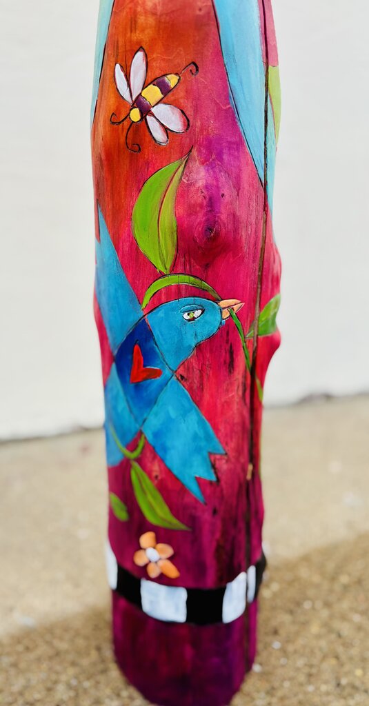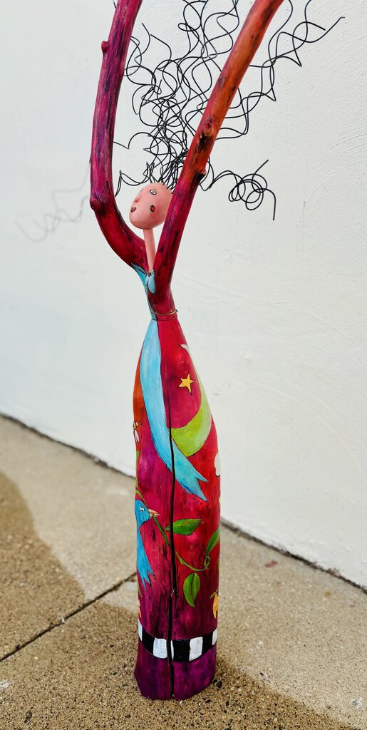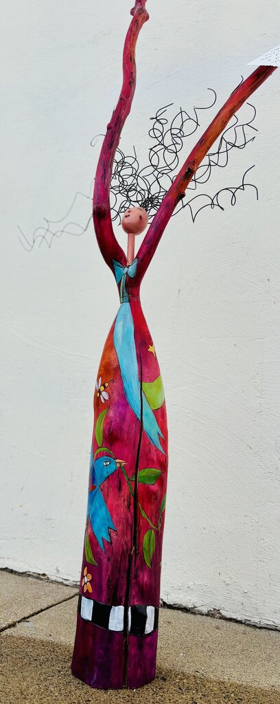 Collectible Sticks Angel with long arms and extended curly hair. Statue has three pieces, first the cylinder base which has a nature split due to age. The second piece is her head and arm attachment and then a separate small bird that attaches at the left arm. Statue is mainly a mix of red and pink colors with images of a bird, bee, and leaves on the base. The angel has a blue bow that spans to the base of her body. DISCLAIMER: Statue is not eligible for shipping, in store pick up only!