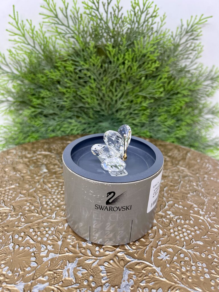 Small Swarovski crystal figurine in the shape of a butterfly. Butterfly has two large wings with a small body and a gold tone face with antenna. Butterfly comes with its original box.