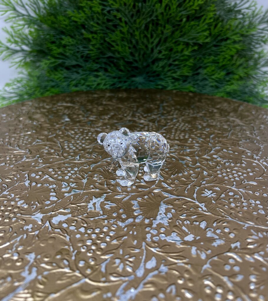 Small Swarovski crystal figurine in the shape of a grizzly bear cub with fish. Bear has life like qualities such as ears, a tail, and mouth, bear also has black eyes and a silver tone fish hanging from its mouth. Figurine comes with its original box!