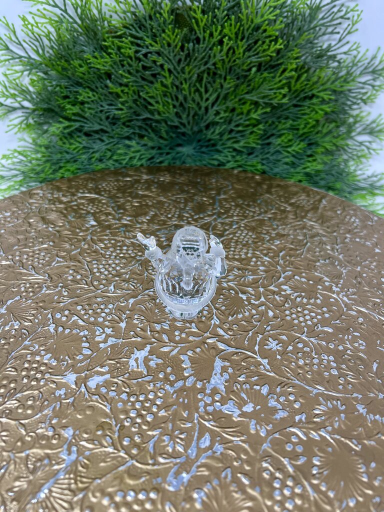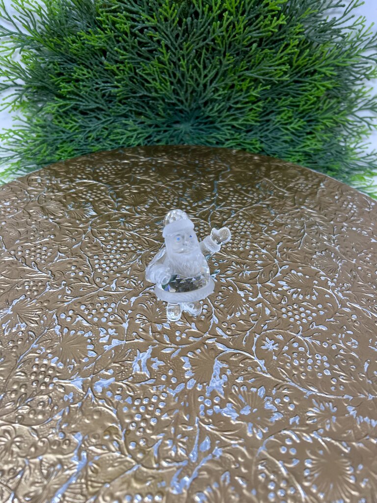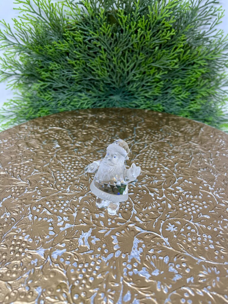 Small Swarovski crystal Santa figurine. Santa is wearing a coat and hat, he has a long beard and his arms are extended. His eyes are small blue stones that shine! Figurine comes with its original box!