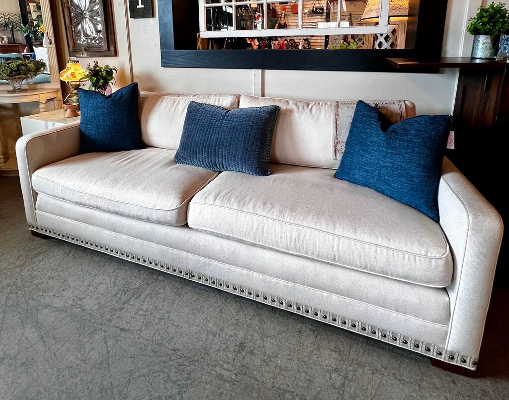 White sofa with two large duck feathered cushions. Sofa has a simple beaded trim along the bottom of the couch and small square wooden legs.
