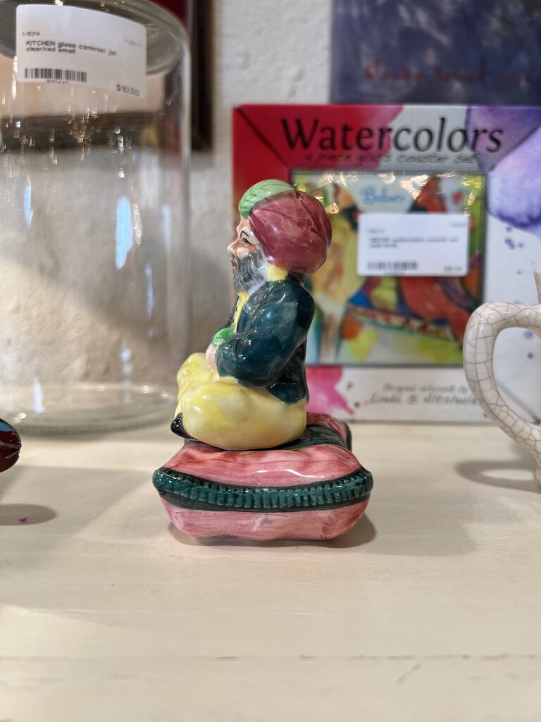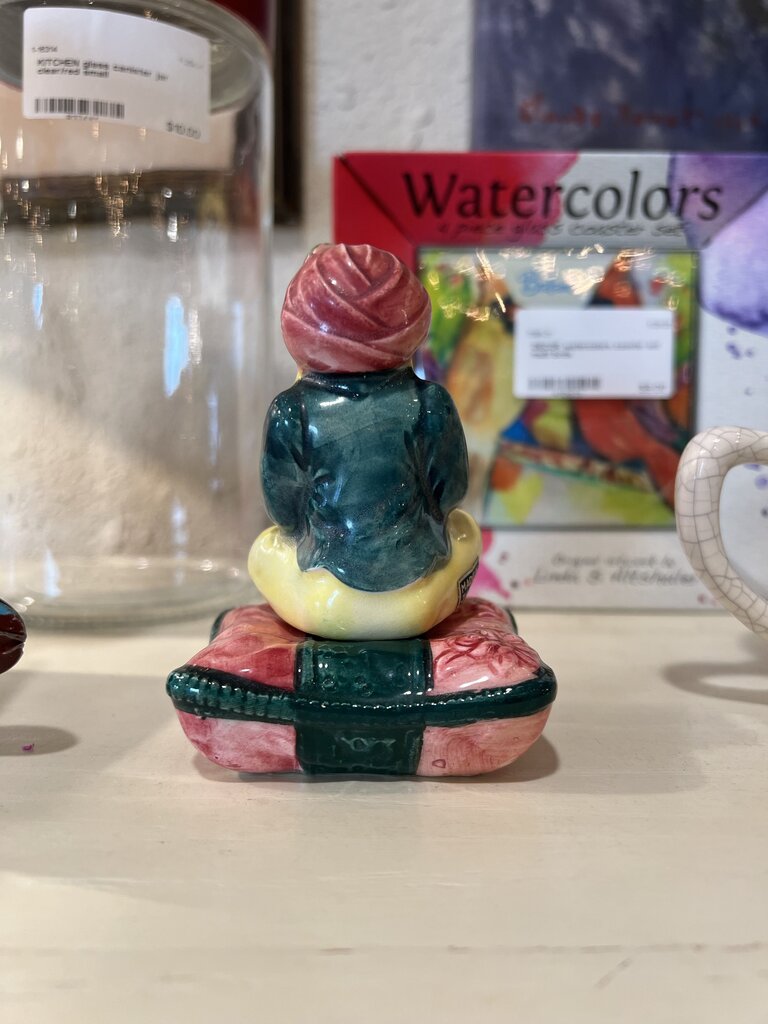 This collectible, colorful ceramic figurine from Japan depicts a small bearded man seated cross-legged on a patterned cushion, holding a bright green orb. He wears a pink turban accented with a green leaf detail, a dark green jacket, and loose yellow pants, all finished with a glossy glaze that enhances the vibrant colors. His cheerful expression and finely detailed facial features give the piece a warm, whimsical character. Designed as a two-piece salt and pepper shaker set, the figurine includes small holes in the base and one in the head for dispensing, with cork stoppers at the bottom of both the figure and cushion. Authenticity is marked by Japan stickers on the side of the figurine’s leg and the bottom of the cushion.