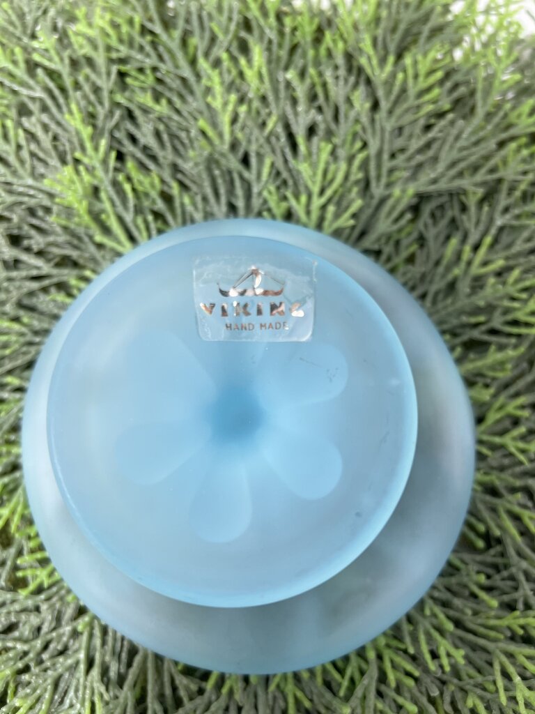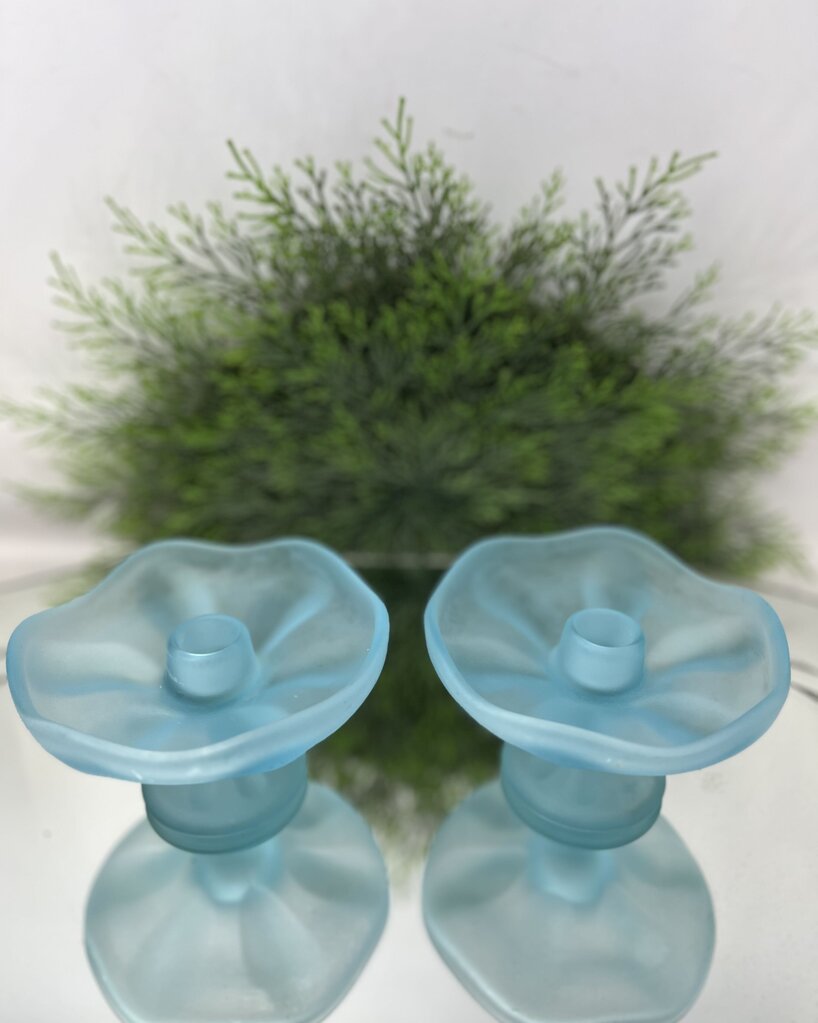 Collectable blue satin glass pedestal style candle holders featuring a frosted satin finish and a vibrant blue hue, giving them a soft and translucent finish. The tops of these candle holders are designed to resemble a lotus flower with wavy edges and swirl pattern inside. In the center of the candle holders, there is a opening designed perfectly for a taper/dinner candle. The bottoms both original paper labels which read "VIKING handmade".